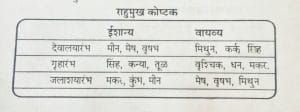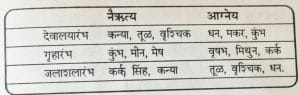 देवालये गृह व जलाशय यांच्या आरंभाचे वेळी ज्या ज्या राशीला सूर्य असेल त्यावरून ईशान्यादि विदिशेला राहूमूख असते ते पुढच्या कोष्टकावरून जाणावे.