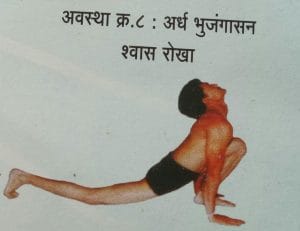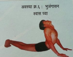 एकला श्वास घेत नमस्कार स्थिती, दोनला श्वास सोडत जानुभालासन ,तीनला अवस्था श्वास घेत अर्ध भुजंगासन,चारला श्वास रोखलेल्या स्थितीत हस्तपादासन ,पाचला श्वास सोडत अष्टांगासन, सहाला श्वास घेत भुजंगासन ,सातला श्वास रोखलेल्या स्थितीत जानुशिरासन,आठला श्वास रोखलेले स्थितीत अर्धभुजंगासन, नऊला श्वास सोडत परत जानू भालासन.दहाला श्वास घेत परत नमस्कार स्थिती .अशी सूर्यनमस्कार घालत असताना योगासनातील सहा आसनांची एक साखळी तयार होते. त्यामुळे भारतात नव्हे तर संपूर्ण जगात आरोग्याच्या दृष्टीने सूर्यनमस्काराला विशेष असे महत्व प्राप्त झाले आहे . म्हणूनच सूर्यनमस्कारातील आसन आणि व्यायामाचे तंत्र अंगीकारण्याचा प्रयत्न अनेकजन करताना दिसतात.